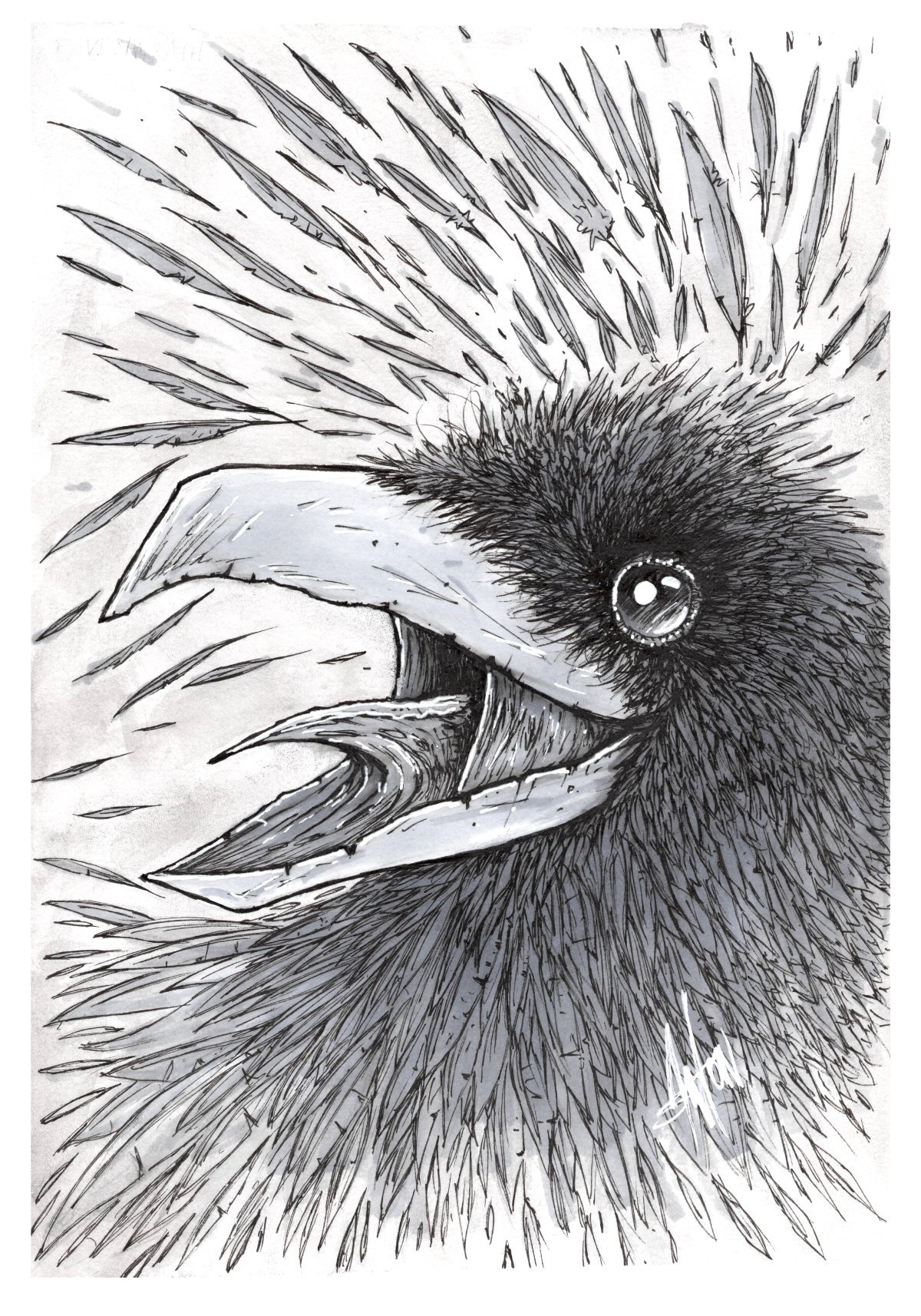 I used various fine-line Micron pens for the feathers, a selection of grey Prismacolor markers for shading on the bird, and a bit of inkwash paint for the background.